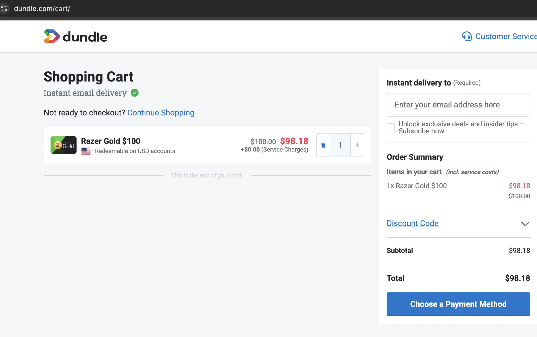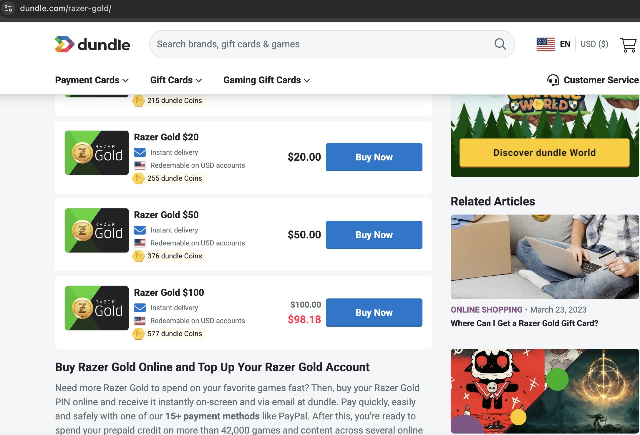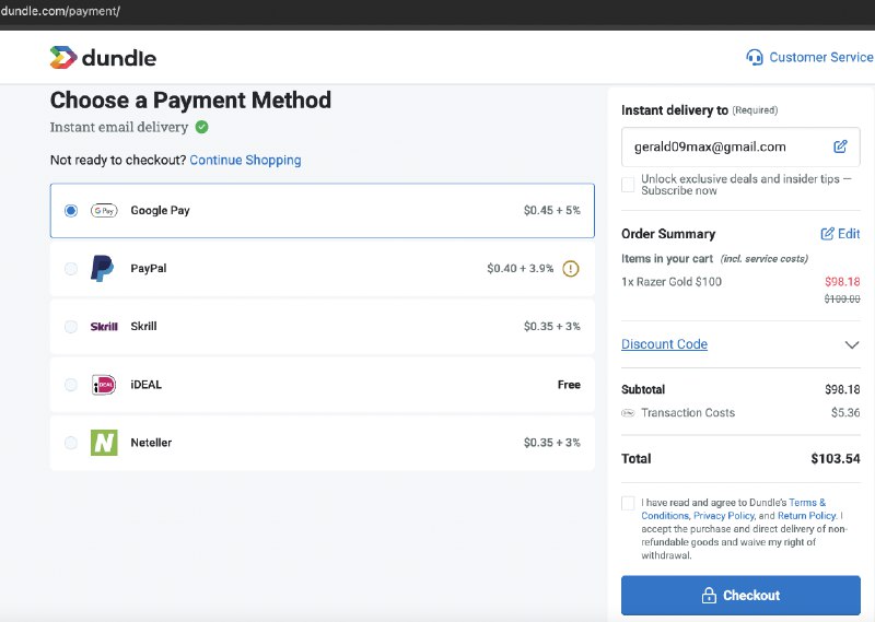 The below steps are provided to buy a Razer Gold giftcard for any amount via Paypal from Dundle.com.